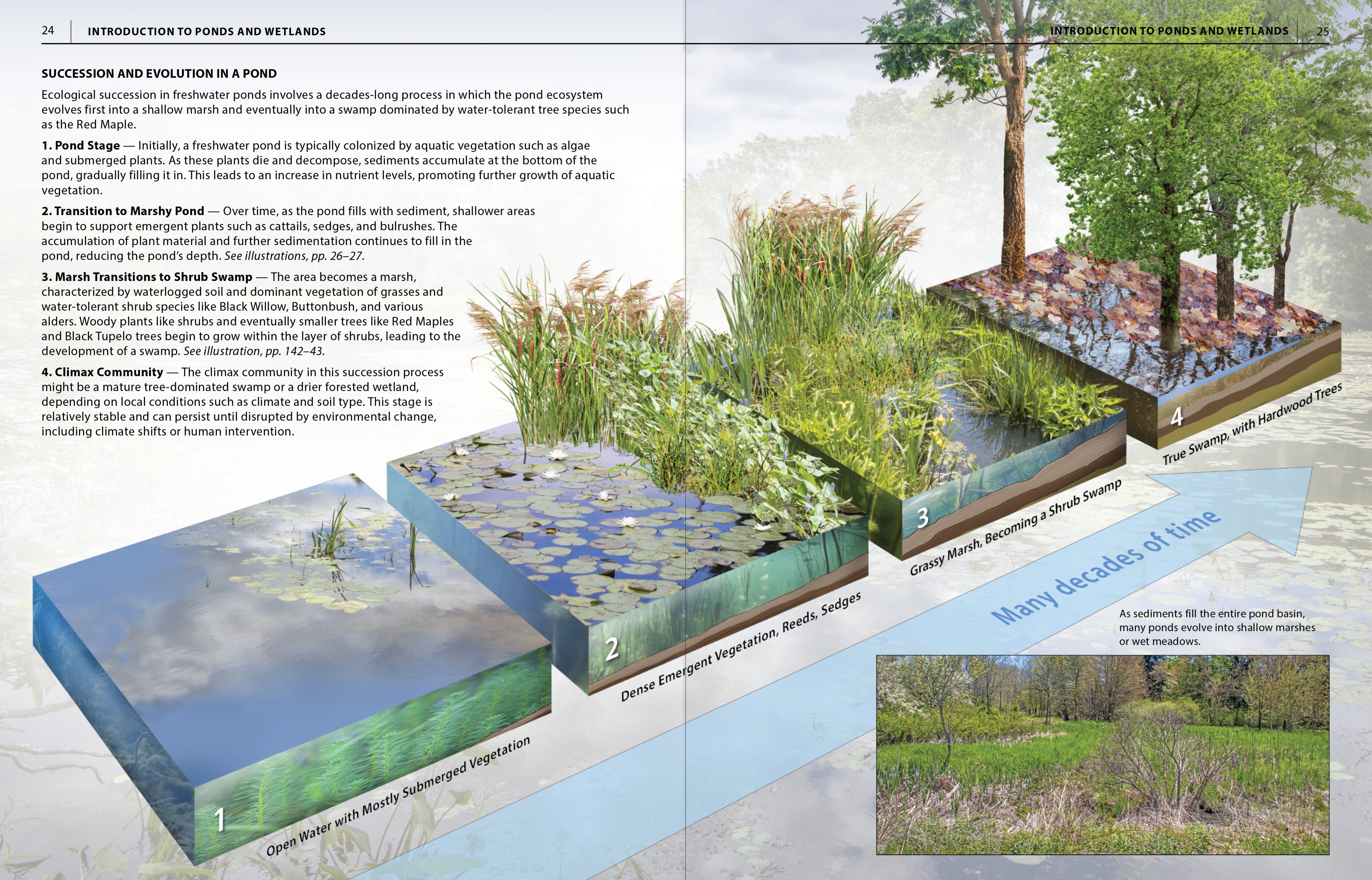 Ecological succession in freshwater ponds is a decades-long process in which the pond ecosystem evolves from a shallow marsh to a swamp dominated by water-tolerant tree species such as the Red Maple.